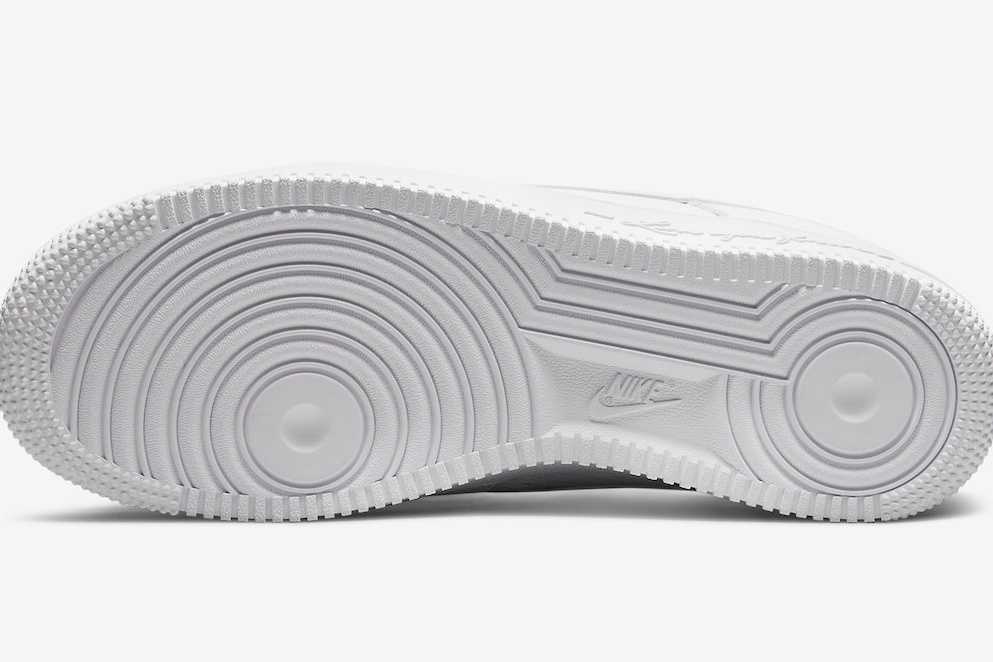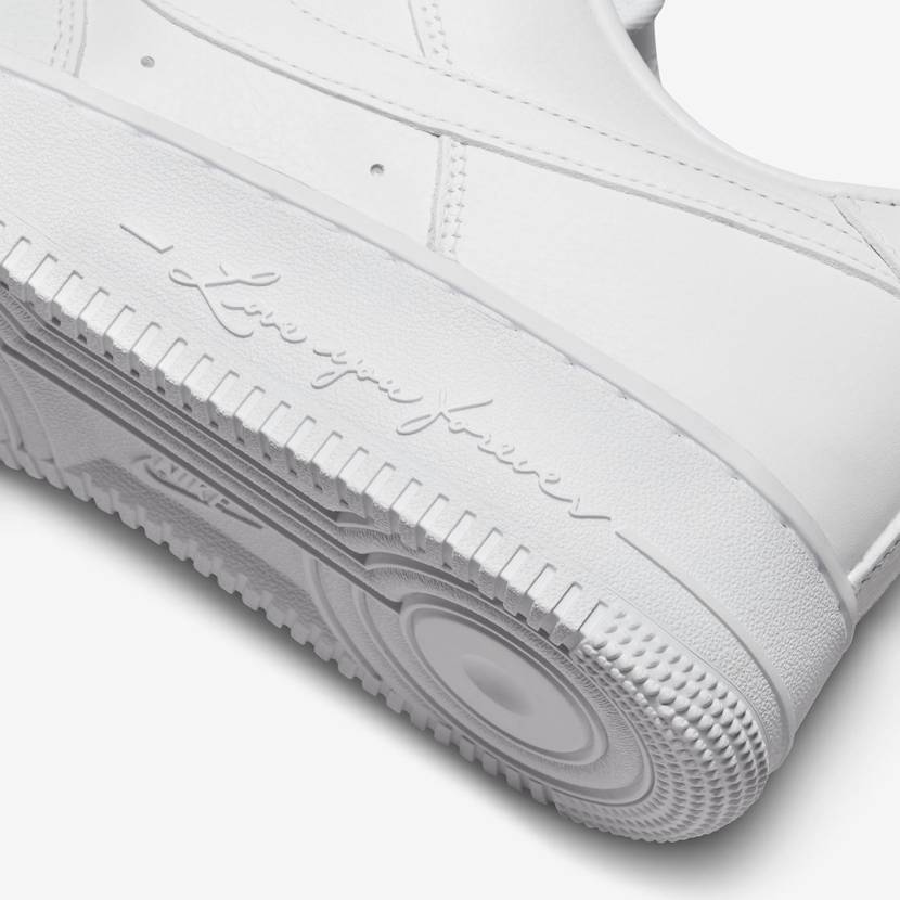 "AIR FORCE 1(エアフォース 1)"をベースに、ストリートの定番にして、最もアイコニックなカラーでもある、"WHITE ON WHITE"で染め上げた。ミッドソールには定番の"AIR"の文字から、“LOVE YOU FOREVER”のテキストへとアレンジ。ソール裏のトゥとヒールのグリップには、定番の"スター"から"DRAKE"が愛する"ハート"へと変更するなど、往年の魅力をそのままに、細やかなスペシャルディティールが映える。