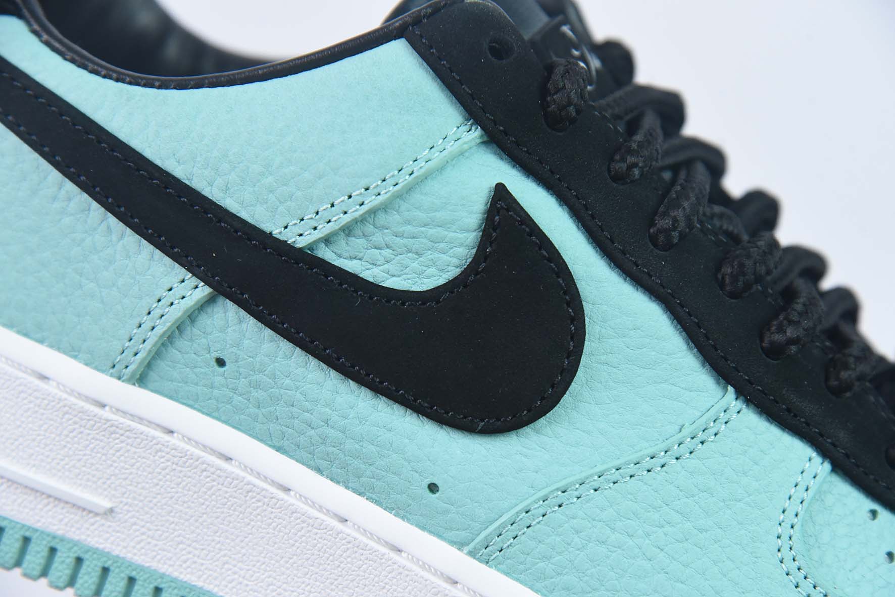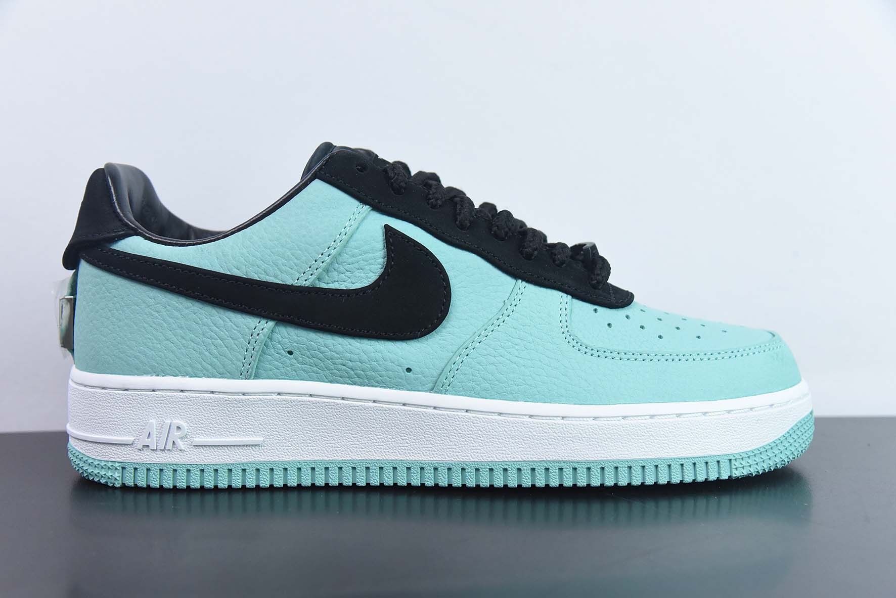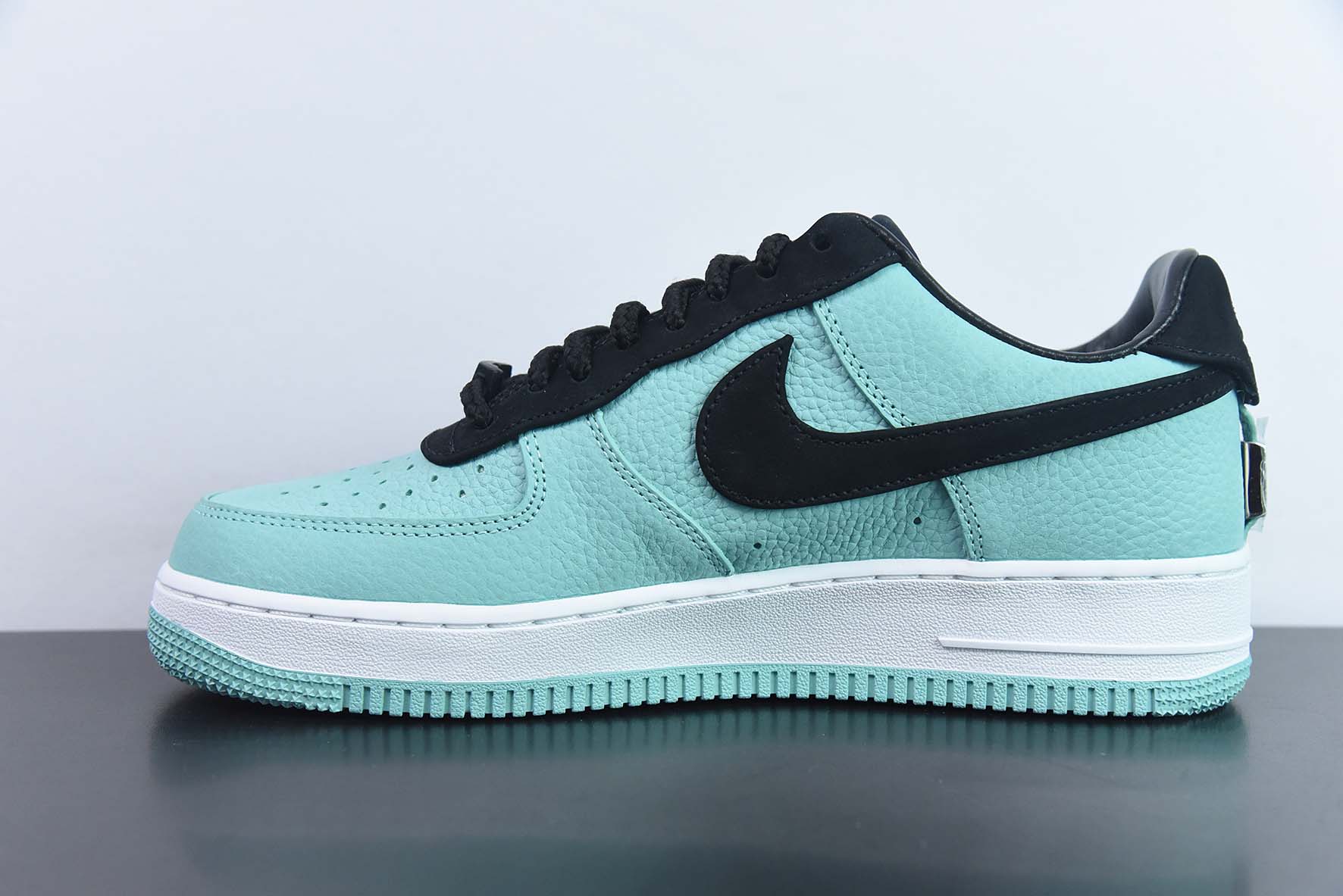 Tiffany & Co. x Nike Air Force 1 Lowのこちらのアイテムは、ティファニーブルーのロールアップレザーのアッパーに、ブラックスエードのシューアイ、スウッシュ、ヒールを採用しています。靴の舌と革裏地には引き続き黒が登場し、ティファニーのブランドロゴを象徴しています。ティファニーブルーのラバーのアウトソールに白いミッドソールと追加のシューレースがデザインを仕上げています。